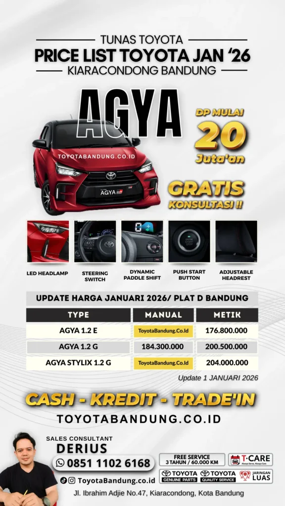 Jangan lewatkan kesempatan untuk memiliki Toyota Agya GR Sport 2026. Pesan sekarang di Tunas Toyota Kiaracondong Bandung dan dapatkan penawaran terbaik dari kami. Klik tombol Minta Penawaran atau Hubungi Sales sekarang juga untuk mendapatkan mobil city car sporty yang memenuhi semua kebutuhan Anda.