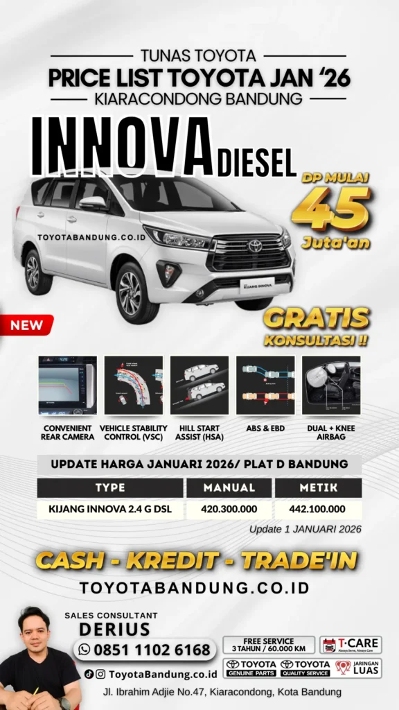 Toyota Innova Reborn Diesel menjadi pilihan utama bagi keluarga dan pebisnis di Bandung yang mencari mobil MPV tangguh, irit bahan bakar, dan nyaman digunakan harian.