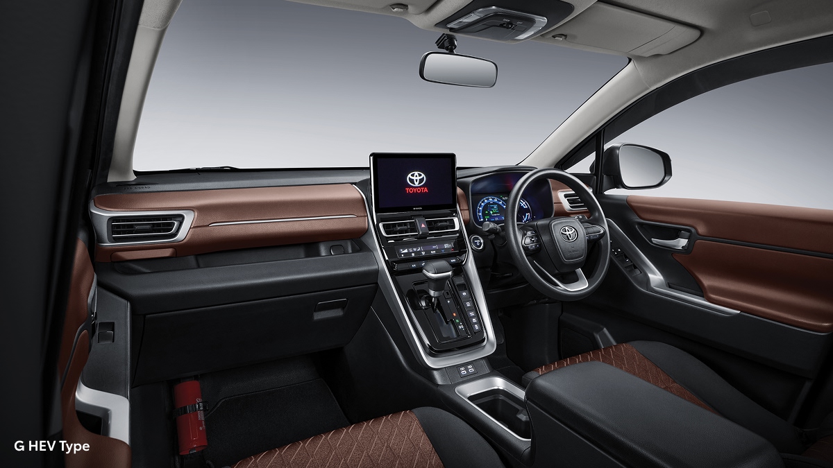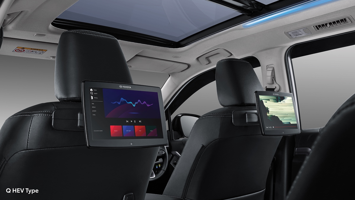 Head Unit baru berukuran 9 inci untuk tipe G dan 10 inci untuk tipe V memiliki segudang fitur menarik. Mulai dari Bluetooth, Wi-Fi, Voice Recognition, dan juga Smartphone Connectivity. Anda juga bisa cek saldo kartu tol melalui fitur NFC E-Toll Card Checking. Penumpang pada bangku baris kedua dan ketiga akan dimanjakan dengan Dual Rear Seat Entertainment ukuran 10 inci yang bisa disambungkan dengan internet.