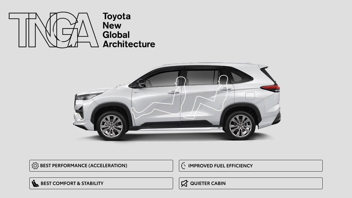 Penggunaan platform TNGA-C terbaru menghadirkan ruang yang lebih luas pada kabin. Penumpang pada baris kedua bisa merasakan bangku dibalut Fabric berkualitas dengan ruang untuk kaki yang lebih luas. Ada juga cup holder yang bisa digunakan dengan mudah. Sabuk pengaman dengan Seatbelt Reminder tentunya menjadi fitur yang tidak bisa diabaikan. Demi kenyamanan terbaik, juga tersedia New Captain Seat with Ottoman (Q HV), New 10” Head Unit with Smartphone Connectivity (Q & V HV), New 10” Dual Rear Seat Entertainment (Q & V).