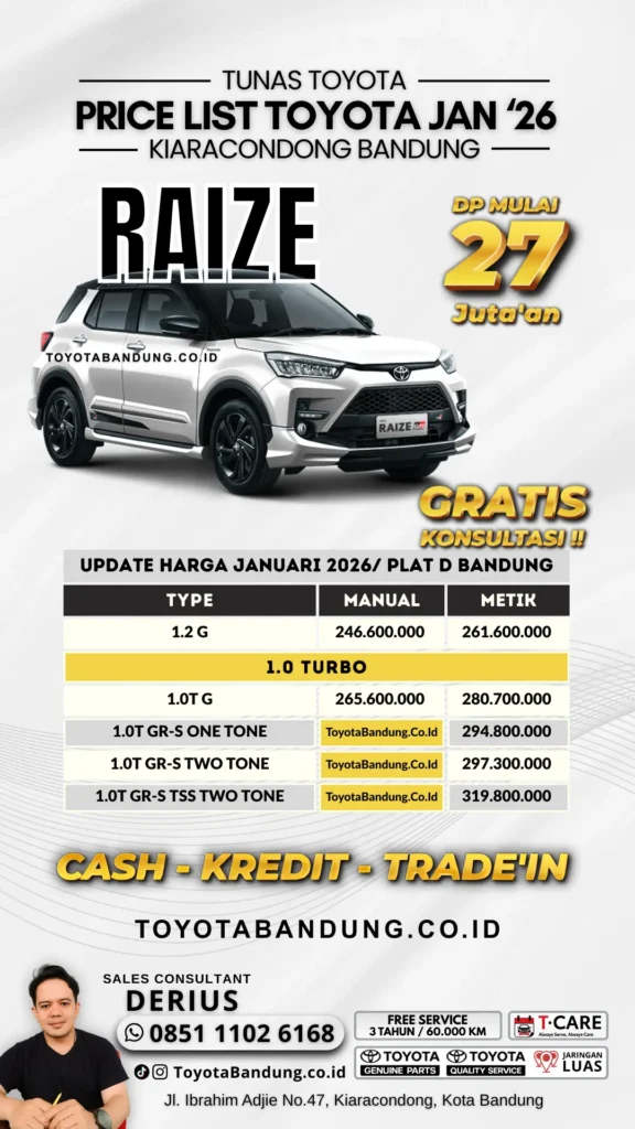 Toyota Raize GR Sport 2026 adalah Varian sporty dari Raize dengan tampilan dan performa yang ditingkatkan. Harga OTR Bandung untuk Toyota Raize GR Sport 2026 di mulai dari untuk varian terendah hingga untuk varian tertinggi. Terdapat 2 pilihan varian yang tersedia untuk Toyota Raize GR Sport. Hubungi sales Tunas Toyota Kiaracondong untuk informasi lengkap dan promo menarik.